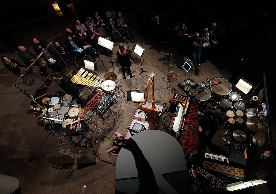 The first half was a performance of Luciano Berio's "Circles", a setting of poems by E. E. Cummings for soprano (sung by Maria Männistö), harp and percussion — just look at the picture! But despite the number of instruments, the music was often spare: stretching out, or bubbling up, or erupting, from an empty background.